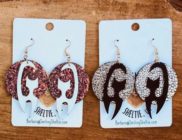 Sow your love of cats with this unique combo of wearing these delightful earrings. Shown with 2 moon options - white cat has a multicolored glitter moon while the black cat has a gold metallic moon. Moons are reversible and has hypoallergenic fish hooks. Custom earrings are available to match you favorite 4 footed fur baby.