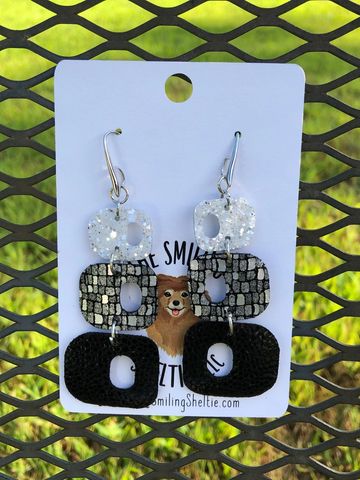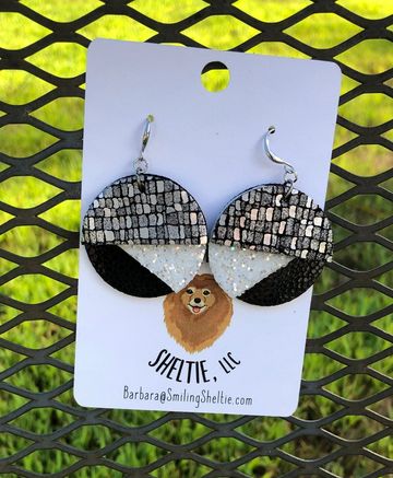 A modern take on circles using metallic silver, white glitter and shiny black leather. Black suede on reverse side. Hypoallergenic fish hooks.