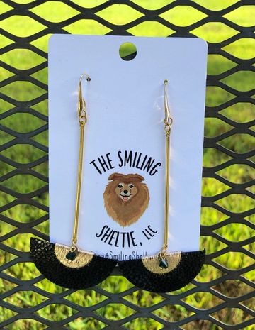 Black leather fan is shiny on front and suede on the back. Black stone dangles onto the gold area for some added bling. Cane is a solid but lightweight pole that provides height and drama to these lovely earrings. Hypoallergenic fish hooks.