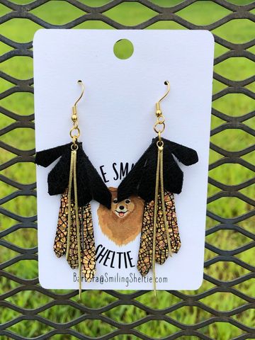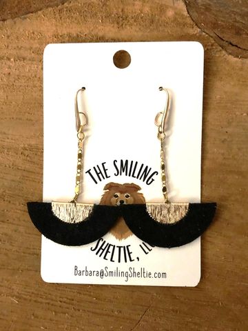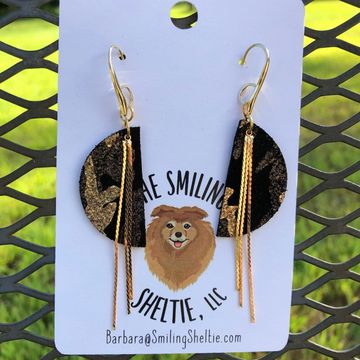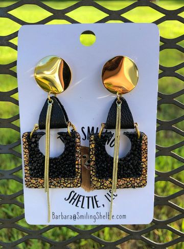 Black and metallic gold leather brings a new look with fringe being bigger and layered. A gold tone chain completes the look. Hypoallergenic fish hooks.