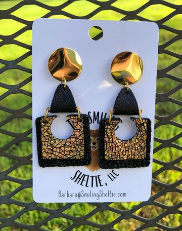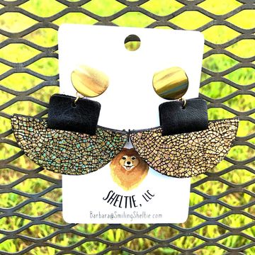 Fan earrings made of metallic gold crackle leather is reversible with a black leather piece attaching it to the gold tone hypoallergenic posts.