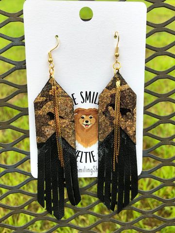 Camo chick never looked so good! Gold metallic camo print paired with black fringe and a multi chain completes the look. Hypoallergenic fish hook earrings provides a fun, easy feel to these earrings. Due to the camo print, no two are alike.