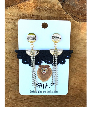 Scalloped black leather earrings with a lacy look with rhinestone dangles and gold tone hypoallergenic posts.