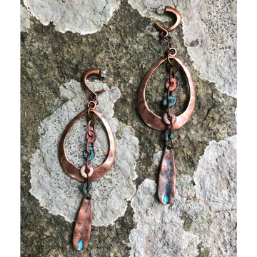 These copper earrings have a lovely patina on them for an old world feel that is complimented with oxidized discs that completes the look. Hypoallergenic hoops.