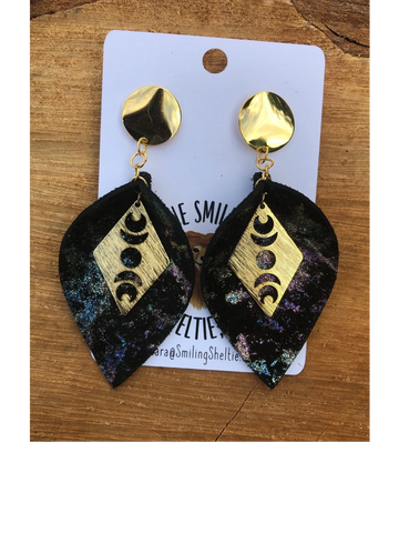 Show off your connection with the moon with these unique earrings. Teardrop is a metallic leather print to highlight the moon with black suede on the reverse side. Hypoallergenic posts.