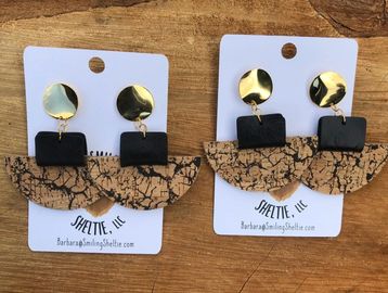 Reversable & classy is the best description for these earrings. Black leather sets off the mottled cork with hypoallergenic studs that looks good with any outfit. Due to the cork pattern, no 2 will look alike.