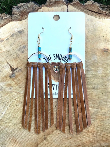 Get that laid back Western feel with these fringe earrings! Turquoise colored stones sets off the fringe that will look good travelling around town. Hypoallergenic Fish hooks.