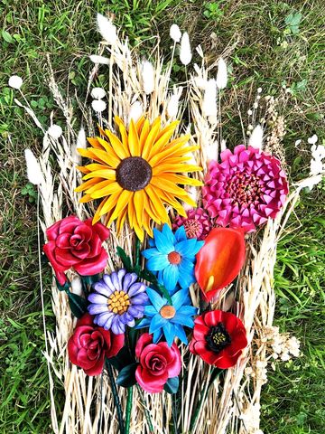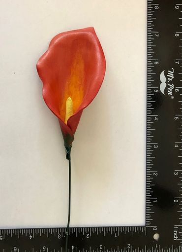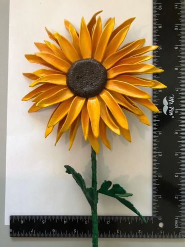 Measurements: Sunflower 6.25" Dia. with a 15" stem, Roses 2.75" - 3" Dia. with a 13" - 14" stem, Poppy 2.5" Dia. with a 12.75" stem, Calla Lilly 2.675" W x 3"H with a 12.25" stem, Aster 3.25"Dia. with a 12.5" Stem, Cosmos 3.5" Dia. with a 12.5" Stem.