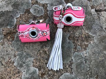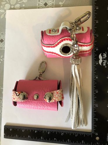 Travel back to the 70's with my mod poop bag holder or put on the ritz with my rhinestone poop bag holder. Both have access from either side with snap colures and fits a standard size bag. Rhinestone and white fringe tassel is removeable so you can use it as added bling on a belt loop or your favorite bag. Additional views shown in Gallery below.