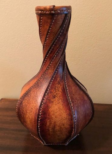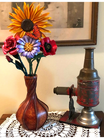 Leather vase is hand dyed to give an old world feel but will also look good in a contemporary setting. Decorative use only and cannot hold water. Use with dried flowers or add in some of my leather flowers To the right and below to complete the look.