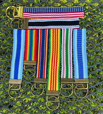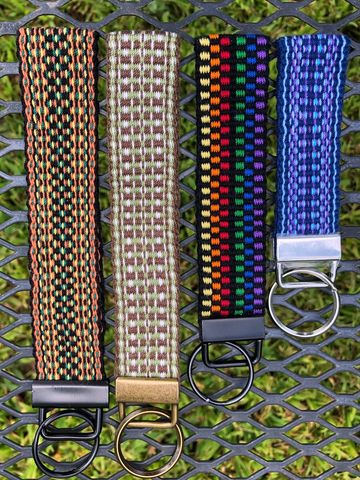 Hand woven key fobs in 100% cotton available in 3 lengths to suit your needs. Pictured from left to right is Autumn, camouflage, rainbow, and blues with lavender. Fob portion available in several options. Shown in black, silver and antique brass. Additional views shown in Gallery below.