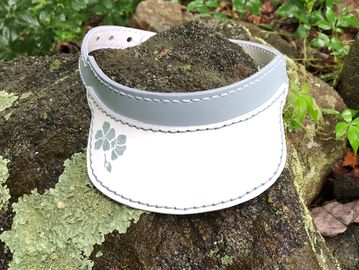 Adjustable visor made of leather with a hand painted flower on the brim. Pair this visor with my sling bag to complete the look. Custom colors are available. Additional views shown in Gallery below. Band adjusts from 20" - 24" and is 1"H, Visor is 6.5"W x 2"D.